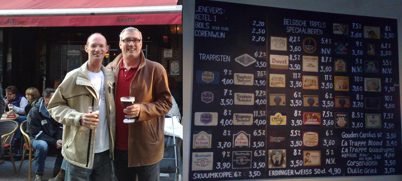 Mike and I enjoying a few beers outside the pub on Saturday afternoon. On the right is a photo I took of just some of the beers available. There are hundreds of beers on offer here. This board shows the price and the alcohol content. Some of them are seriously strong. There are 8%, 9% and 10% alcohol content beers on offer.