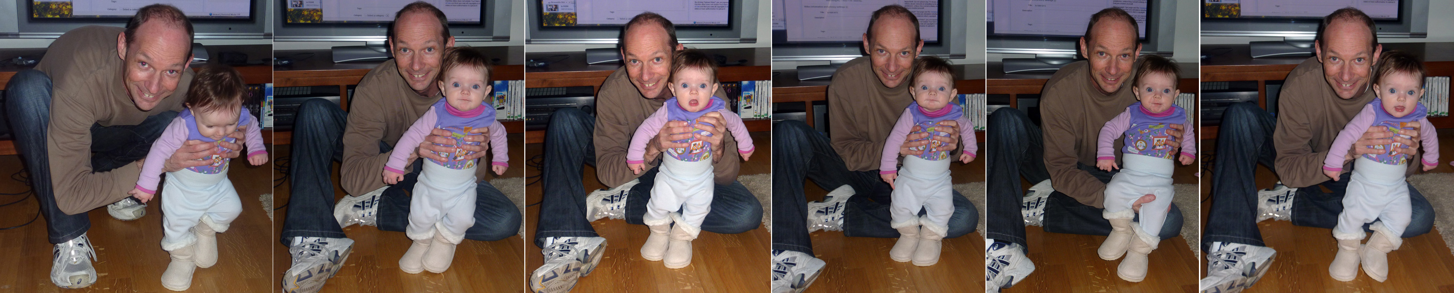 Here is Mia in her new (oversized) Ugg boots. But, how hard is it to get a good baby photo? On this occasion, it was difficult, but hilarious. We took 6 photos and they all have funny looks on Mia’s face. But we finally got one in the end. Please click to see the larger version.