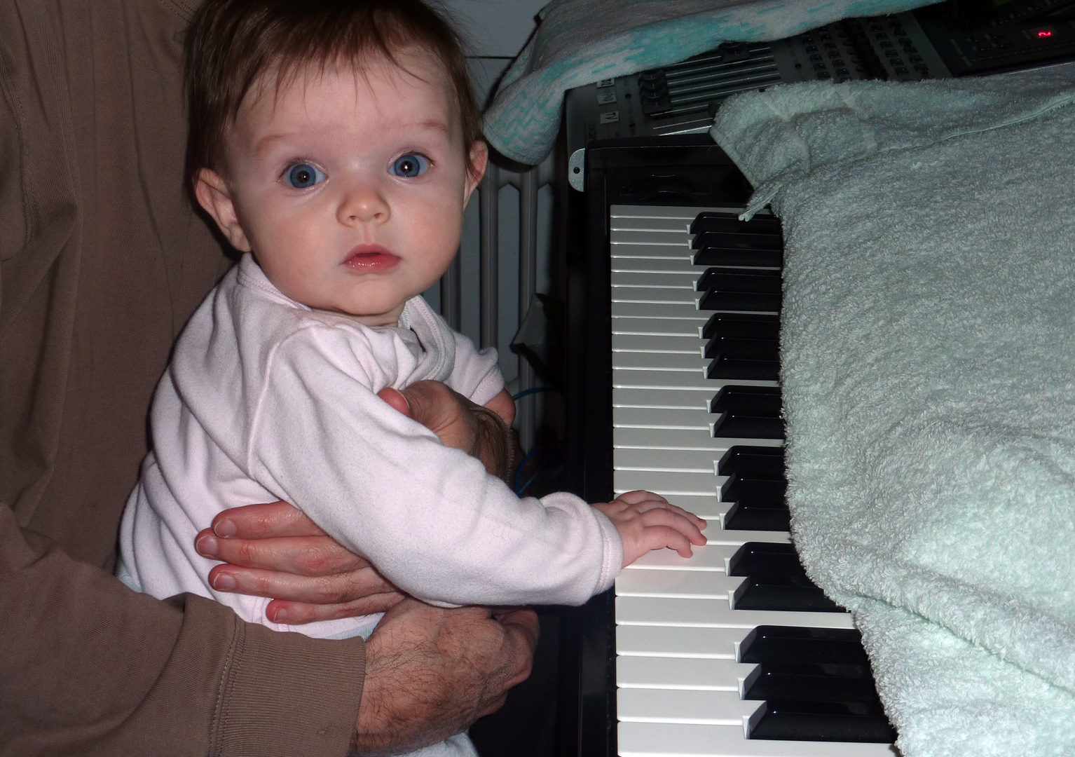 Will Mia be musical? Who knows… But she will certainly have the opportunity to find out. Here she is starting early and quite enjoying the piano sounds. I don’t think 4 month olds are supposed to understand cause & effect yet, but Mia is trying to dispel that myth… (Good photo Gab) ! Please click for large version.